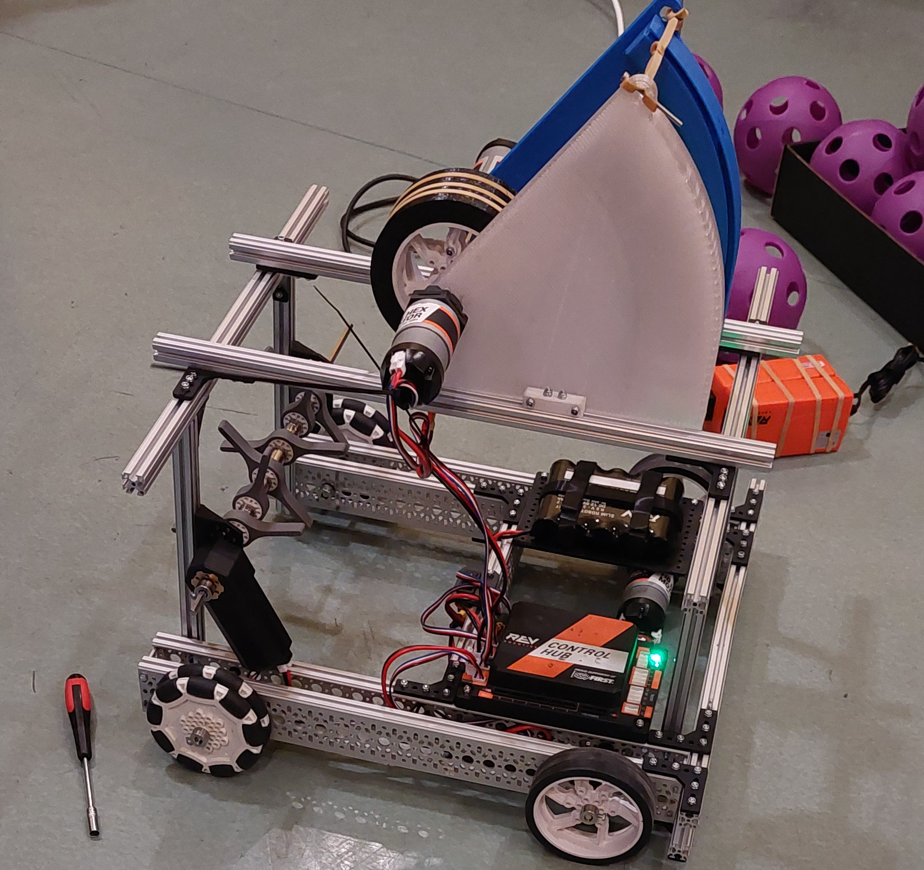 Our mechanical team designed and built a strong, lightweight, and highly efficient structure optimized for fast movement and accurate scoring. The chassis and frame are engineered to provide stability during high‑speed maneuvers while keeping the overall weight low for improved agility. Building on this foundation, the robot features several custom‑built mechanisms created specifically for this season’s challenges. Each component is carefully designed, tested, and refined to ensure smooth operation and reliable performance on the field.